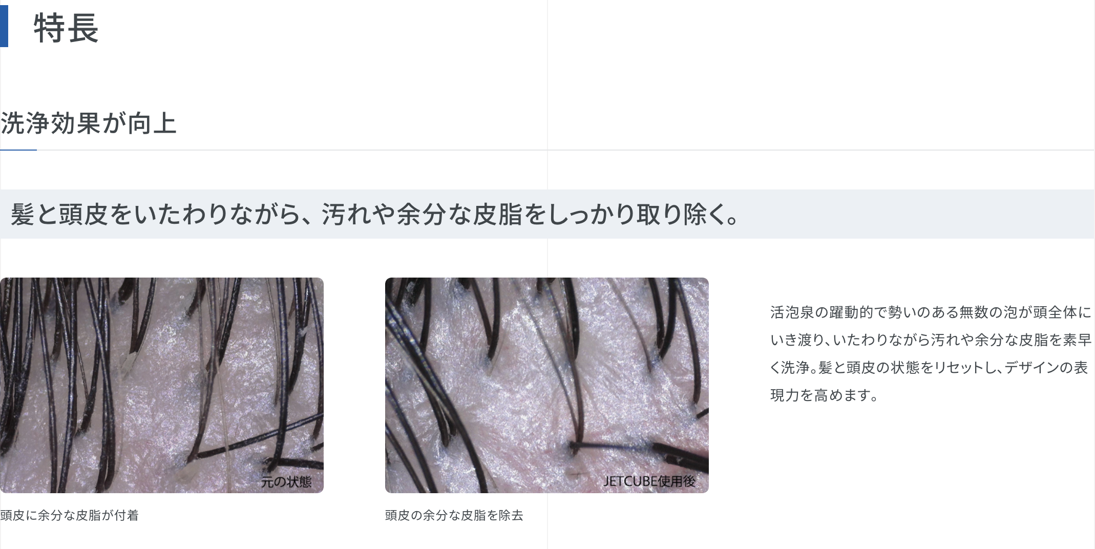 そして大小混ざった空気の力で洗浄効果を高めてフワッとした髪の立ち上がりを実感していただけます。